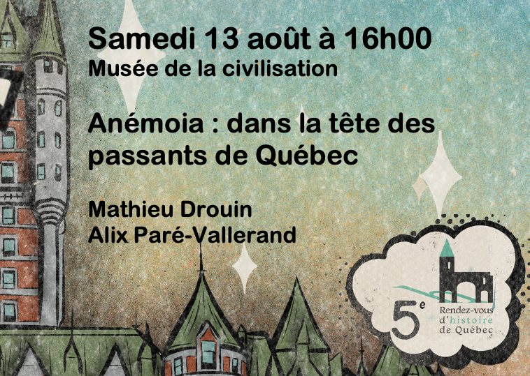 Anémoia est une série d’émouvantes expériences audiovisuelles ancrées dans l’histoire, les lieux et les passants de la Ville de Québec. Le terme «anémoia» réfère cette émotion indescriptible empreinte de nostalgie, de douceur et d’envie de connaître une époque révolue. Créées spécialement pour les 5e Rendez-vous d’histoire de Québec, cinq capsules conjuguant images vidéo d’archives, musique d’époque, ambiance sonore, impressions poétiques et émotions permettront de se plonger dans les pensées des passants de Québec des années 1920 à 1950. Déambulons avec eux près des vitrines des grands magasins, aux abords des manufactures et usines, marchons en leur compagnie à l’ombre du Château Frontenac ou sur les plaines d’Abraham! Cette présentation spéciale permettra de découvrir les cinq capsules sur grand écran, puis d’échanger avec quelques-uns des artisans du projet. Anémoia sera aussi disponible sur la chaîne Youtube des Rendez-vous d’histoire de Québec.