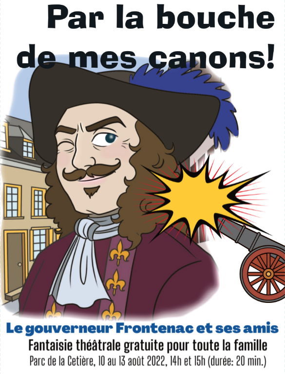 Pour souligner dignement le 400e anniversaire de Louis de Buade de Frontenac, les Rendez-vous d’histoire de Québec sont fiers de consacrer un beau programme d’activités au bouillant gouverneur de la Nouvelle-France. En plus du colloque qui se tiendra le 11 août au Château Frontenac, le public est invité à assister à la fantaisie théâtrale «Par la bouche de mes canons!» Dans ce petit spectacle créé spécialement par La Roche-Francoeur, trois comédiens en costumes d’époque interpréteront de truculents personnages… et révèleront quelques petits secrets entourant la vie de Frontenac!