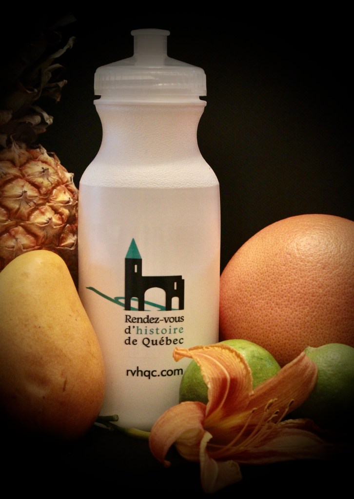 C’est l’été, il fait chaud, il faut se déplacer entre le Musée de la civilisation (conférences), le Château Frontenac (colloque 400 ans Frontenac) et le Monastère des Augustines (Salon du livre d’histoire)… il est donc fortement recommandé de vous munir d’une bouteille d’eau! Mais si vous oubliez la vôtre, pas de souci: il sera possible de vous procurer la gourde officielle des Rendez-vous d’histoire de Québec au coût de 12 $ (taxes comprises) en passant à notre Salon!
