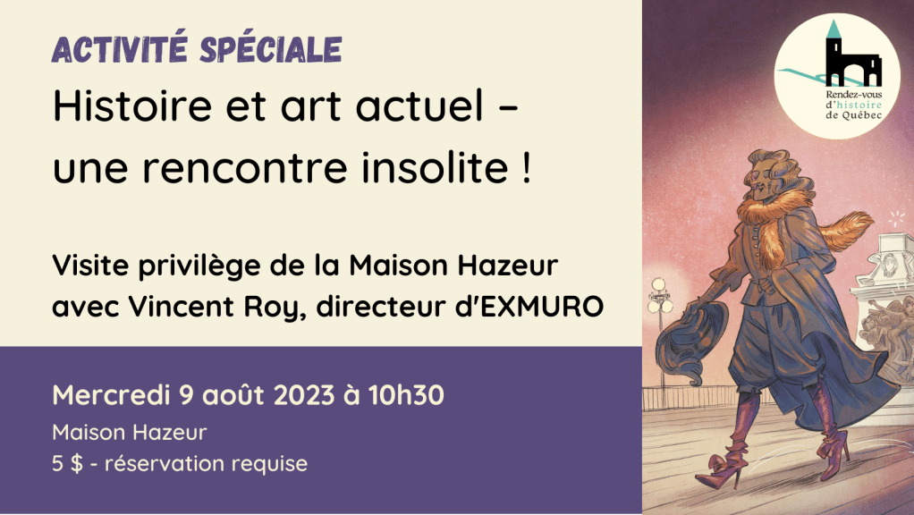 Depuis l’été 2022, l’organisme d’art public EXMURO occupe la maison historique Hazeur, située au cœur de la Place-Royale de Québec. Ce bâtiment, érigé vers 1685 par le marchand François Hazeur, cumule près de 350 ans d’histoire, offrant aujourd’hui un lieu très inspirant pour les artistes ainsi que pour les visiteurs. Dans le cadre des Rendez-vous d’histoire de Québec, EXMURO souhaite vous faire découvrir, ou redécouvrir ce lieu emblématique du Vieux-Québec, notamment par une visite commentée des expositions intérieures présentées dans le cadre de l’événement PASSAGES INSOLITES. Un rendez-vous où le passé le présent s’entremêlent et fait vibrer ce bâtiment patrimonial distinctif.