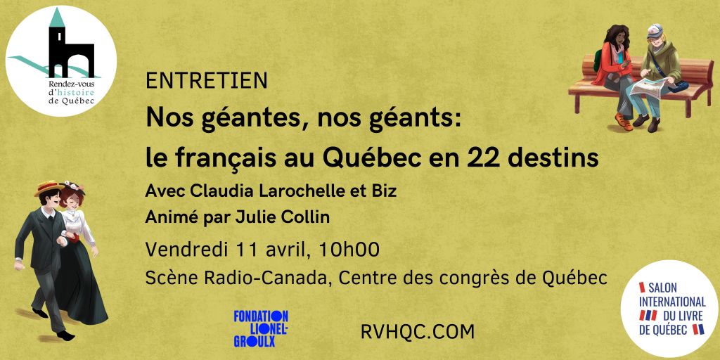 Claudia Larochelle et Biz présentent Nos géantes, nos géants, projet dans lequel s’anime une mosaïque de 22 destinées remarquables, magnifiée par le style coloré de l’illustrateur Benoit Tardif. Les auteurs racontent à leur manière les faits et gestes de personnages plus grands que nature ayant joué un rôle marquant dans la défense et la valorisation de notre langue commune : le français.