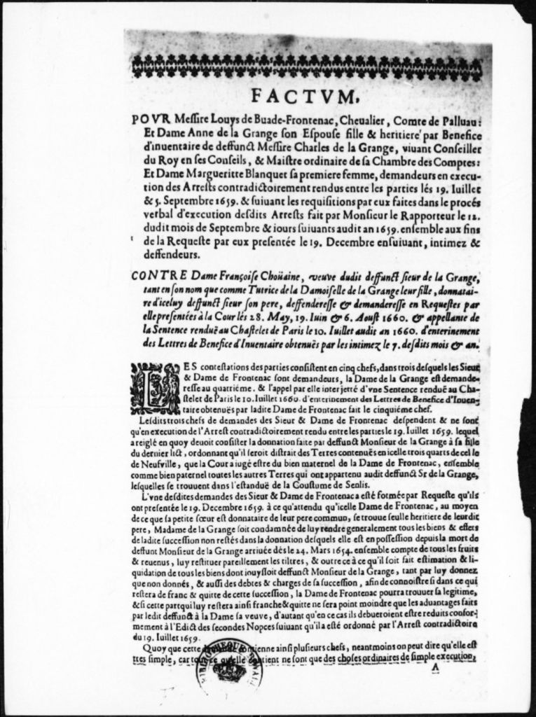 Requête d’Anne de la Grange, épouse de Frontenac pour le règlement de la succession de son père, 1660. BAnQ, Collection Centre d’archives de Québec, P1000,S3,D0296,P5.