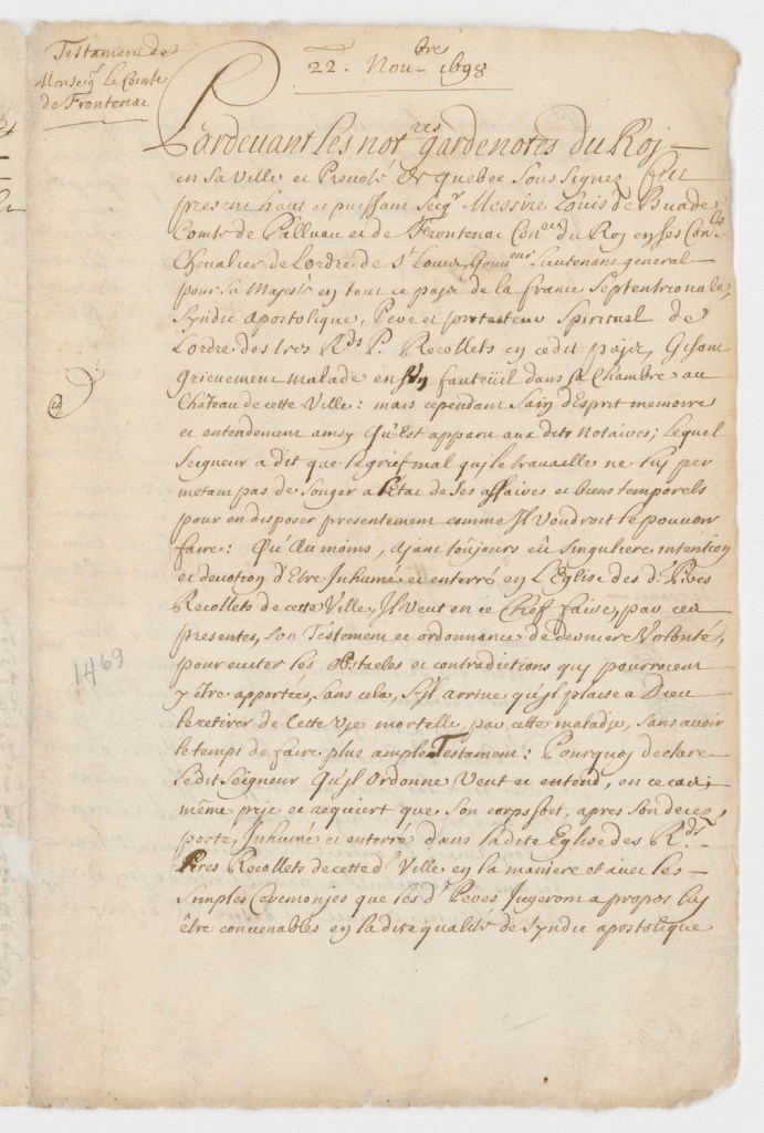 Testament du gouverneur Louis de Buade, comte de Frontenac, 22 novembre 1698. BAnQ, Fonds Cour supérieure. District judiciaire de Québec. Greffes de notaires, CN301,S114,D1469, 4 pages.