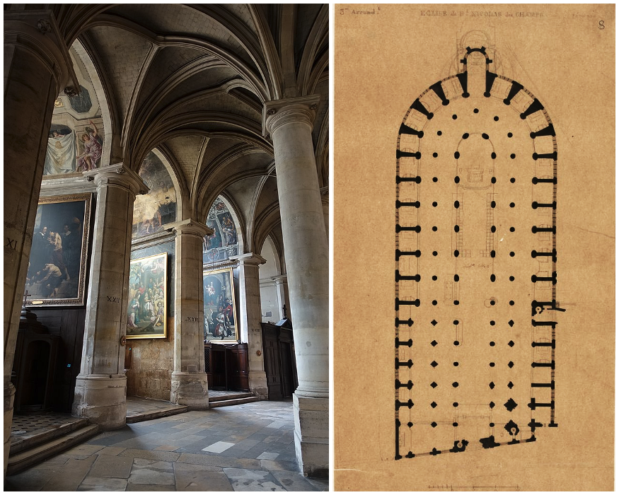 À gauche : Quelques chapelles latérales de Saint-Nicolas-des-Champs. Wikimedia Commons, Paris 16, 2017, Licence Creative Commons Attribution 2.0 Generic. À droite : Plan intérieur de l’église Saint-Nicolas-des-Champs par Lèbe-Sigun, dessinateur, 1861. Musée Carnavalet, D.14500-7.