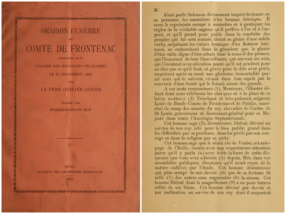Oraison funèbre du comte de Frontenac prononcée dans l’église des récollets de Québec le 19 décembre 1698 par le père Olivier Goyer, publiée par Pierre-Georges Roy, Lévis, Bulletin des recherches historiques, 1985, 36 pages.