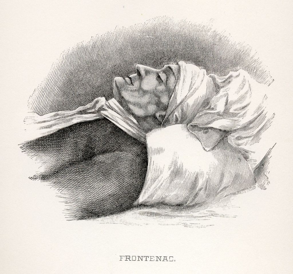 Si cette illustration circule abondamment comme étant le portrait de Frontenac sur son lit de mort, il s’agit en réalité d’une gravure de Jean-Henri Heidegger apparaissant dans l’ouvrage Fragments physiognomoniques pour propager la connaissance des hommes et les exciter à la philanthropie paru en 1778. Voir Ernest Myrand, Sir William Phips devant Québec: histoire d’un siège, 1893.